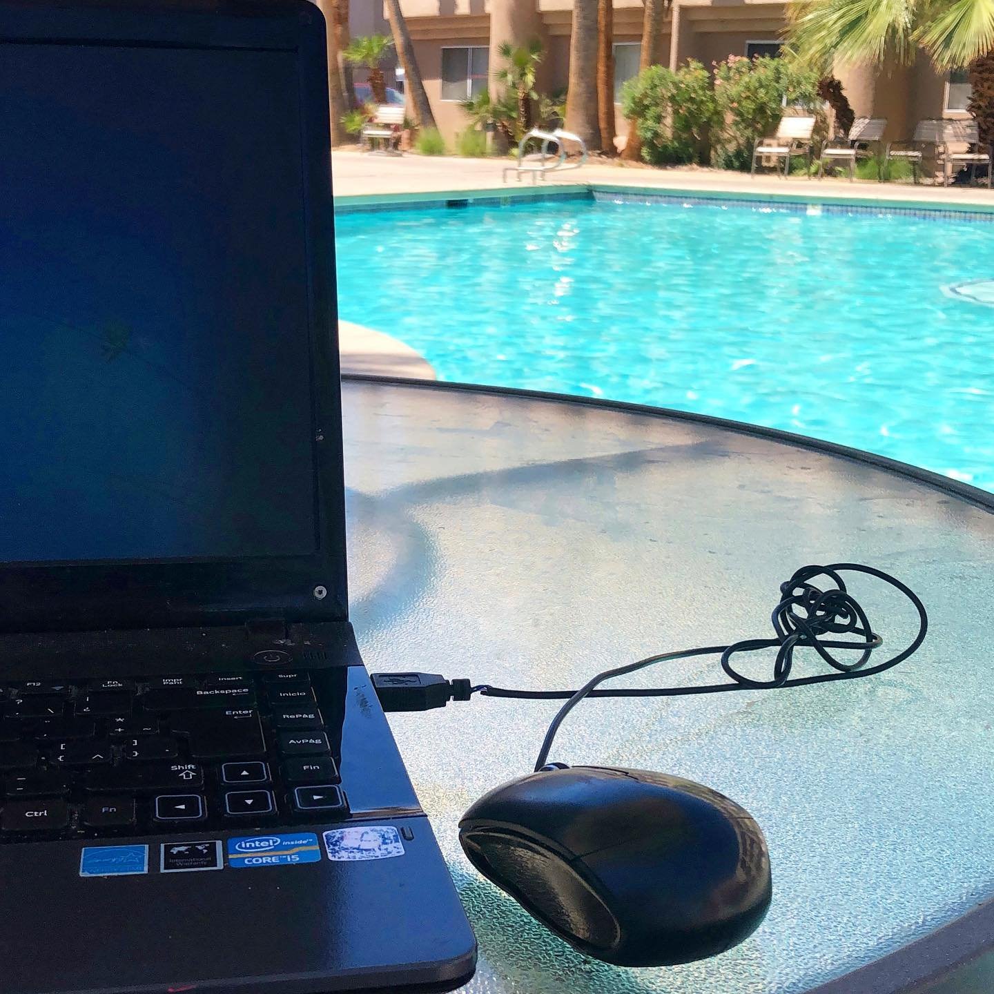 Empecé trabajando en la cama pues a las 6am no se me ocurrió un lugar mejor. Después en el desayunodor (?) hasta que me echaron. De ahí a las mesas que había en la pileta. Cuando me quise dar cuenta estaba teniendo calls metida en el jacuzzi. ¿Suena poco serio? Tal vez. Pero tuve tres calls desde ahí y nadie lo notó. No necesitaba la compu, obviamente, y tenía al costadito un cuaderno por si tenía que tomar notas. Estar en una oficina o escritorio o en un jacuzzi, en este caso, no hacía la diferencia. De hecho, las calls eran LA oportunidad porque después con la compu iba a ser imposible estar en el agua. En esos momentos siento que hackeo al sistema. *Buena, ¡rebelde!* Después me acuerdo que estoy reclamando pagos de trabajo de diciembre y se me pasa.