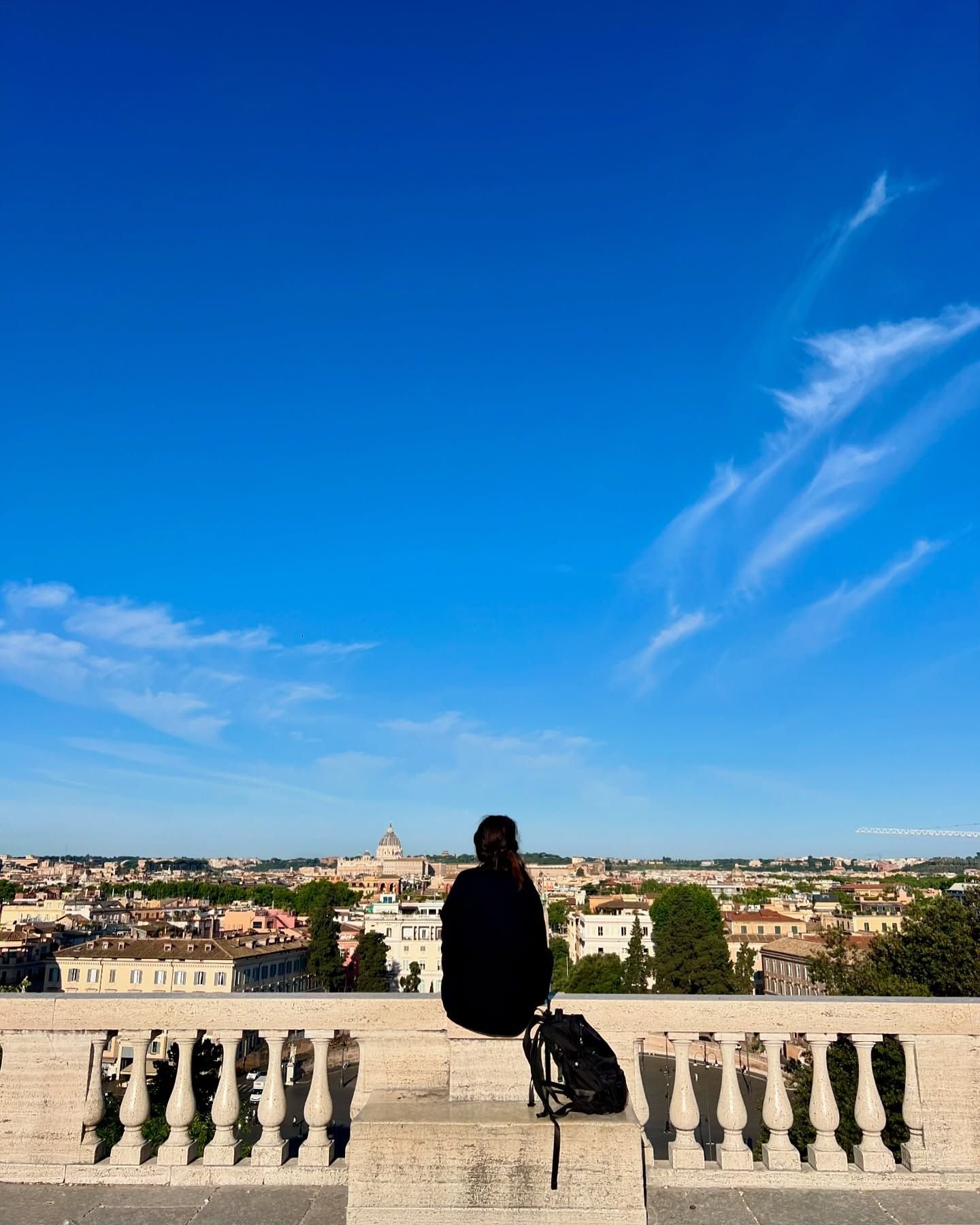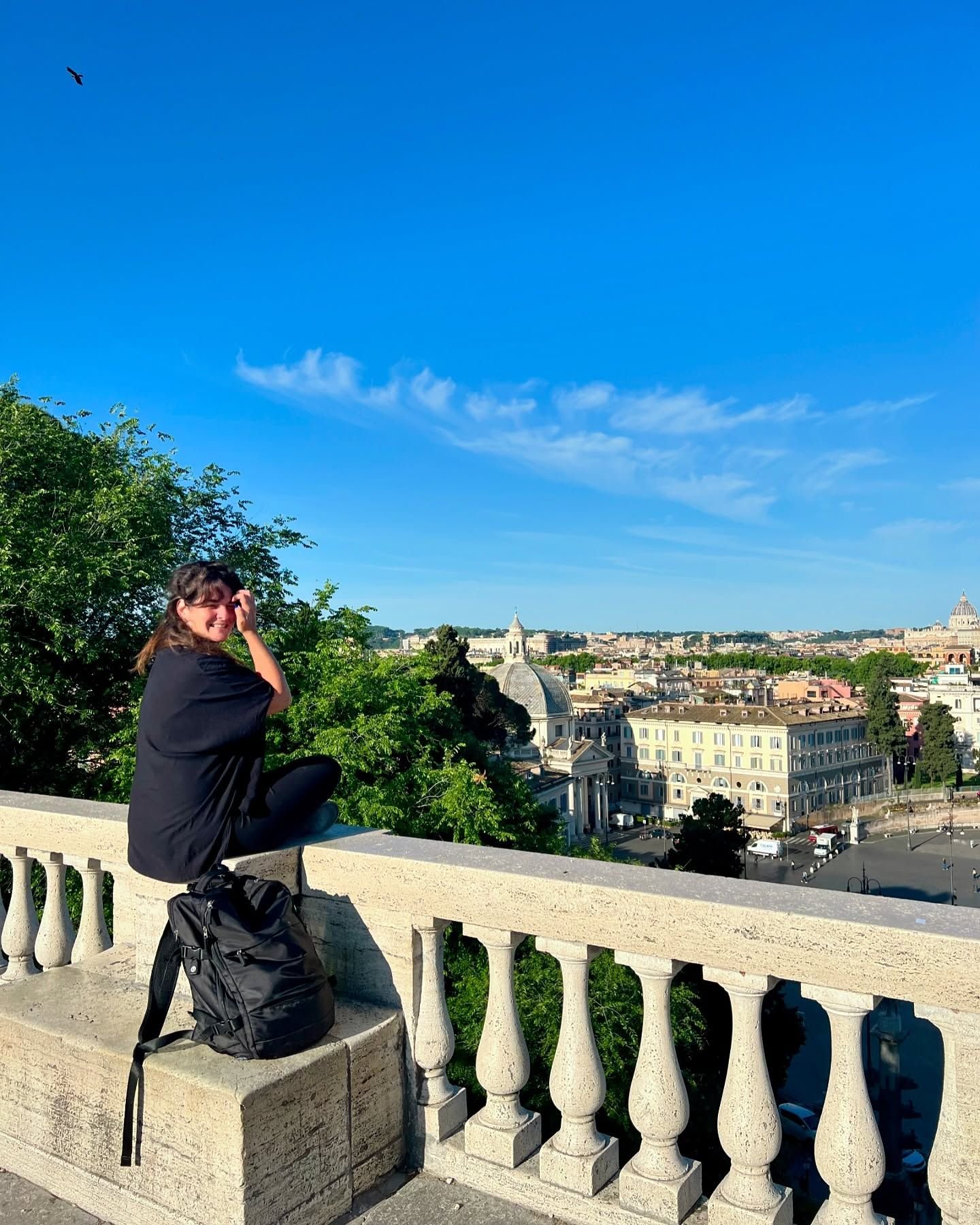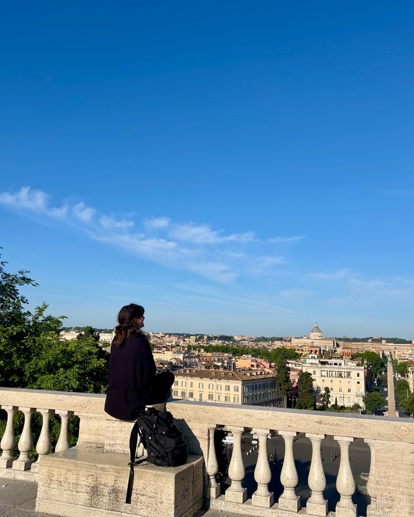 Ese era mi último día en Roma después de un mes. Me desperté a las 4.30am para ir a sacar fotos a la Fontana di Trevi que está infectada de turismo a toda hora. De ahí me fui a Piazza di Spagna. Seguí caminando escuchando música con la ciudad prácticamente para mí. Cerca de las 7am me senté justo en el mirador que está frente a Piazza del Popolo. Me senté en silencio casi como en un ritual de despedida, de agradecimiento. Estaba re en una. Entonces, una chica se acercó y me dijo: “Estás hermosa, esta imagen es hermosa. ¿Quéres que te saque una foto?“. En otro momento probablemente le hubiera dicho que no. Nunca acepto cuando alguien me quiere sacar fotos. Esta vez dije que sí, con vergüenza, incómoda, pero dije que sí. Tenía razón, era una linda imagen y yo formaba parte de ella.